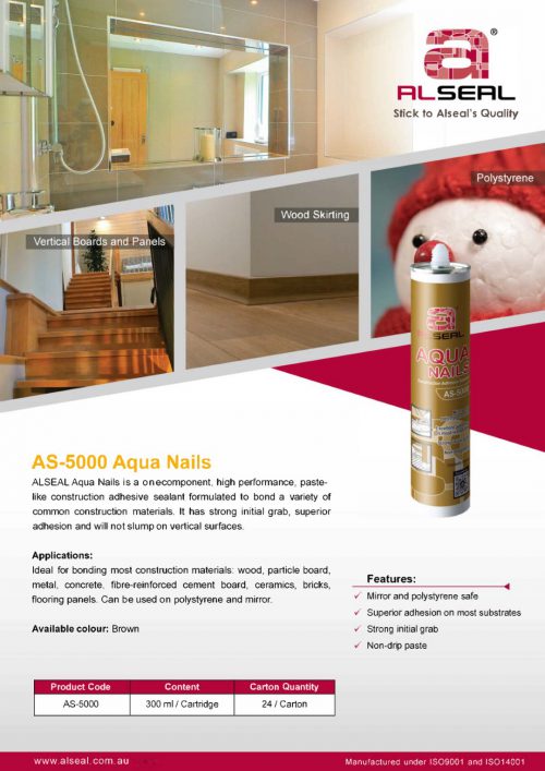 Aqua Nails AS-5000 is a one-component, high-performance, pasty construction adhesive. The purpose for bonding a variety of common construction materials. Construction adhesive for indoor and outdoor use. AS-5000 provides the strongest adhesion, exceptional adhesion to the surface, and long-term strength. It has a strong initial grip, excellent adhesion, and will not sag on vertical surfaces.
